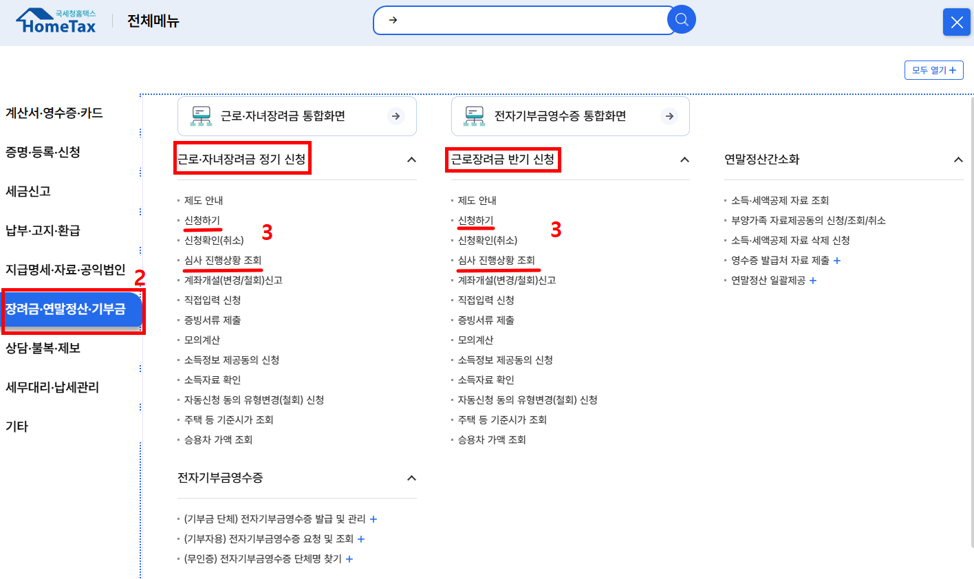 ※ 홈택스에서 전체 메뉴 → 장려금, 연말정산, 기부금 → 근로, 자녀장려금 정기, 반기 신청을 눌러주세요.