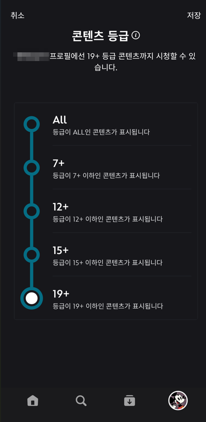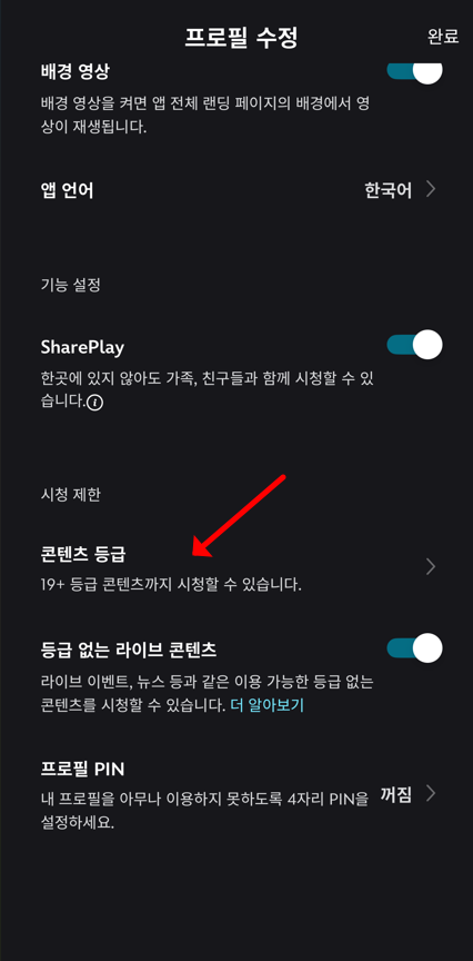 - [프로필 수정] → ‘콘텐츠 등급’ 또는 ‘연령제한’ 설정