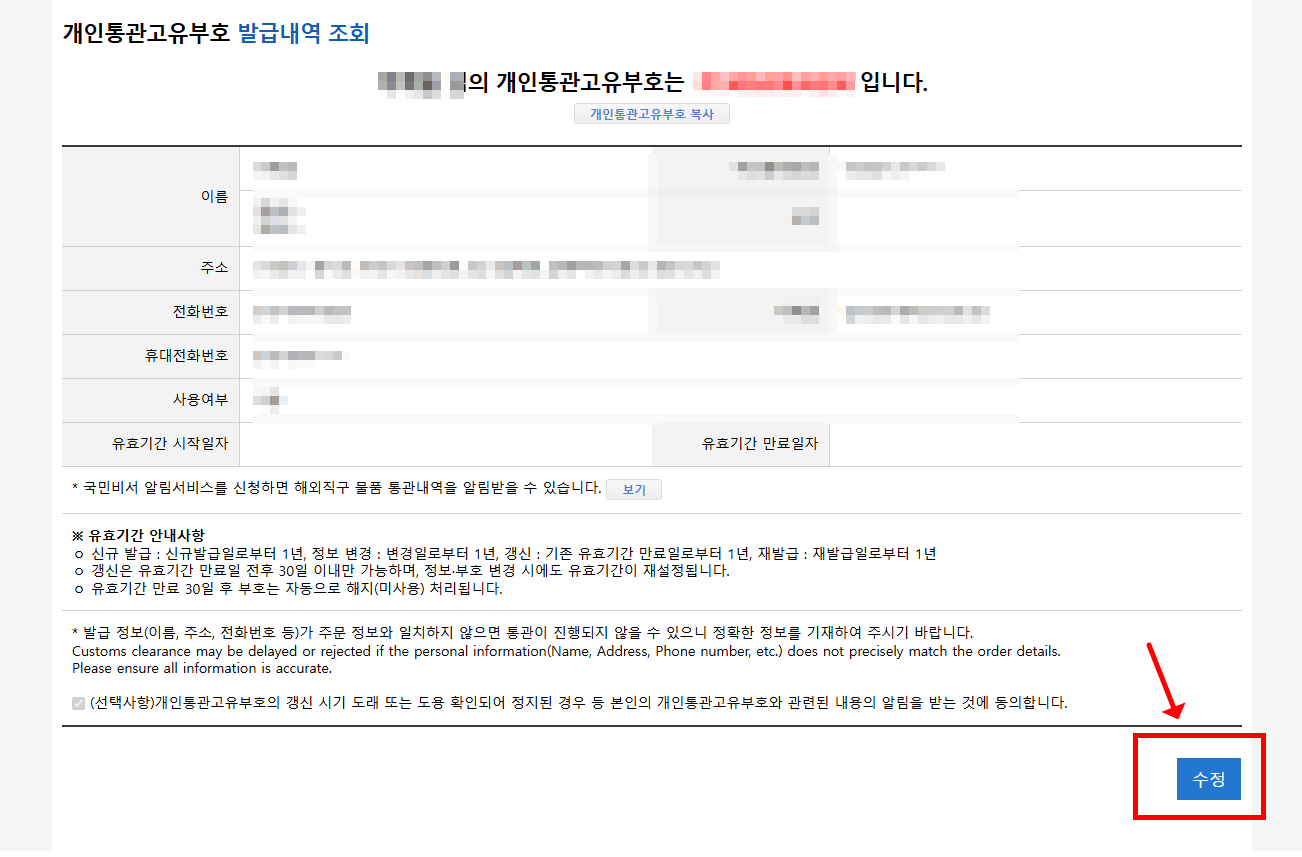 - 배송 중 변경 금지: 현재 해외에서 오고 있는 직구 물품이 있다면, 통관이 완료된 후에 변경해야 합니다. (통관 진행 중에 번호를 바꾸면 정보 불일치로 배송이 지연되거나 폐기될 수 있습니다.)